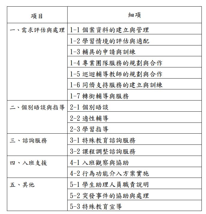 1. 2021 年 4 月 16 日教育部公布「國立高級中等學校辦理身心障礙分散式資源班實施要點」, 資源班 教師除每週基本授課節數外,尚須提供間接服務,其服務項目包含需求評估與處理、個別晤談與指 導、諮詢服務、入班支援及其他特殊教育相關服務事項。請簡要說明以上各服務項目的細項內容。