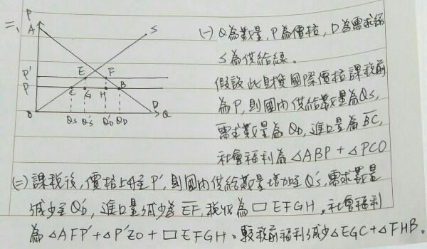 二、 「進口財貨市場為完全競爭下,政府課徵進口關稅會降低人民的福利水 準」 ,請繪圖分析此一論述的正確性。 (25 分)