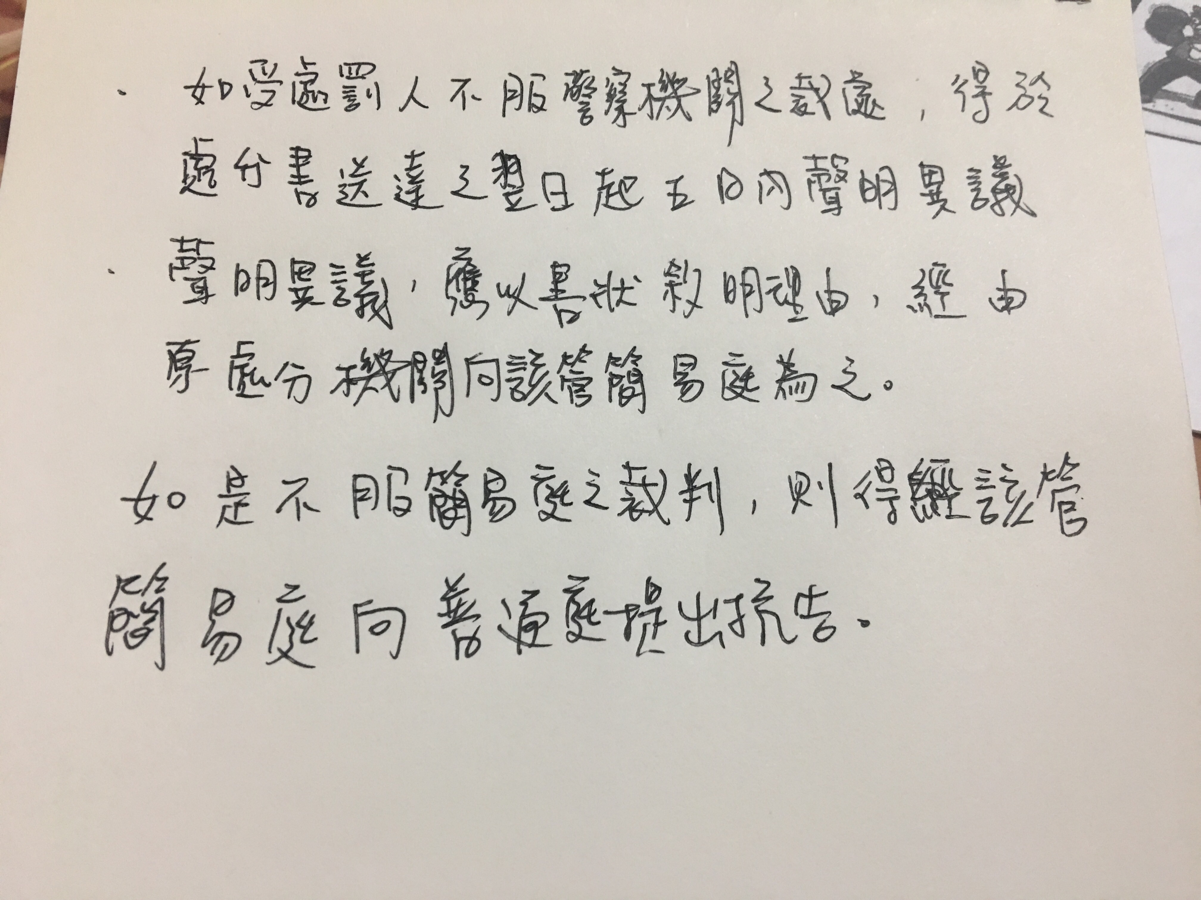 六、不服處分者,得於處分書送達之翌日起五日內,以書狀敘述理由,經原處分之警察機關,向該管簡易庭聲明異議。