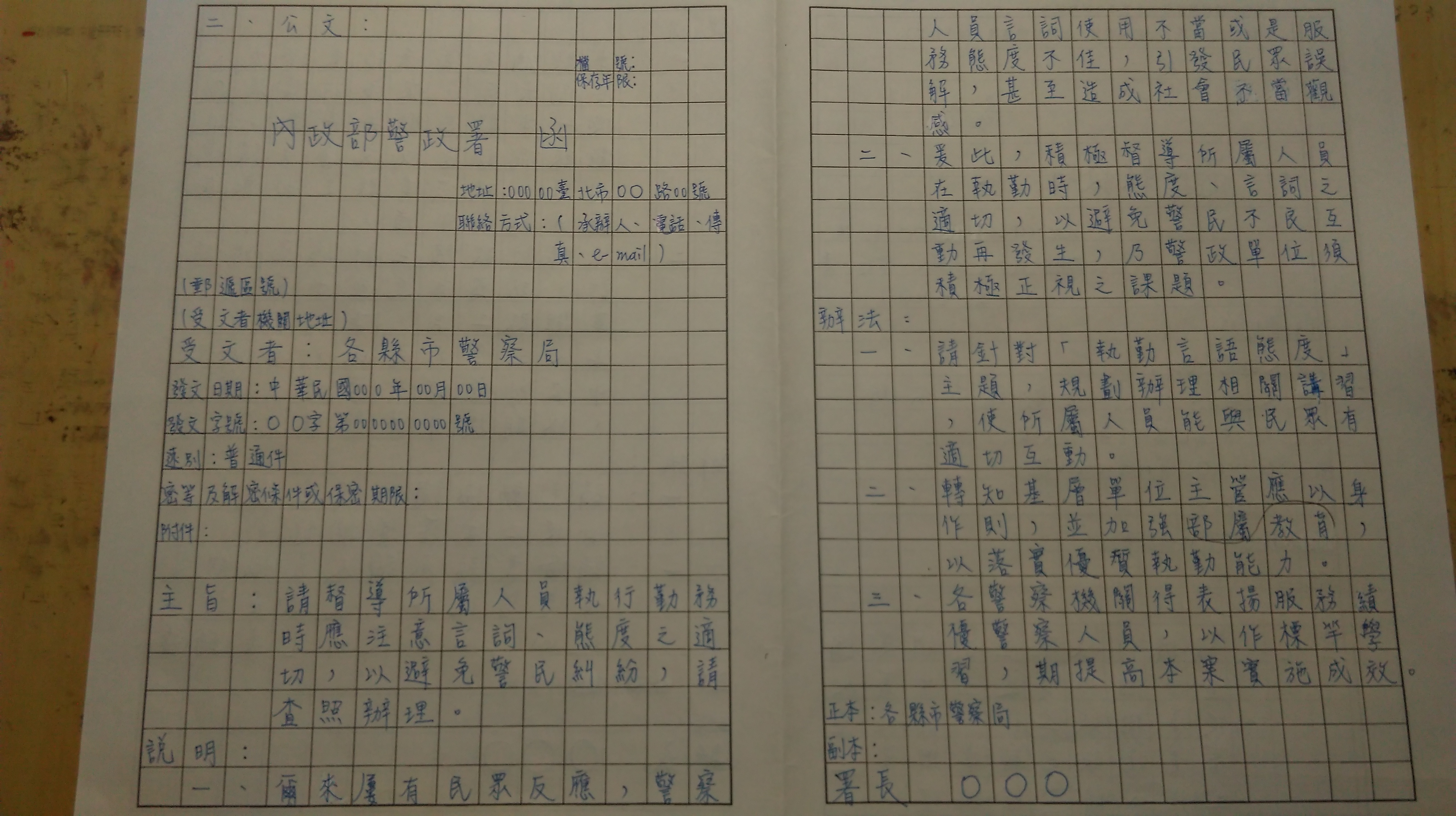 二、公文:(20 分) 試擬行政院衛生署致各直轄市、縣(市)政府函: 依法檢測各類食品,是否符合國家安全標準,並妥善管理,以確保國 民飲食安全及健康。