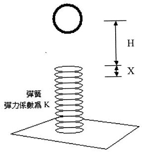 二、如下圖所示,某質量為目之剛性園球,在彈力係數為《之彈簧上方目距離,讓此圓球自由落速度為0),落於彈簧上,使彈簧壓縮變形。假設此彈簧之最大壓縮量為 =?(20分)(提示:重力加速度為g,答案請以M·K、H奥g表示之)