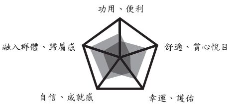 我們對於生活中擁有的物品,需求或看法多少會有改變。例如杯子,一開始只要有盛裝功用就好,後來覺得材質、款式、造型等應該要有舒適感。或如球拍,當初是看到同學們都有便也跟進,如今則帶來贏球的成就感。或如學生證,在校時是拿它享有多種優惠,但畢業後保存它,則是基於校友的歸屬感。或如平安符,小時候戴是為了安神護身,長大後又篤信它能轉運聚財。因此,若把對某樣物品的需求或看法畫成雷達圖,我們會發現:不同階段的圖形可能不一樣。