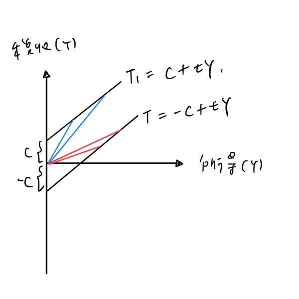 二、某一所得稅制之稅收 T 與所得 Y 之關係,可以下列數學式表示之: T= c+tY ;其中 c 為或正或負之常數, t 為稅率、 0 < t < 1 。請定義此所 得稅之邊際稅率與平均稅率。並請以圖形或以數學證明:常數 c 之正負 與該稅制稅率結構累退或累進之關聯。(25 分)