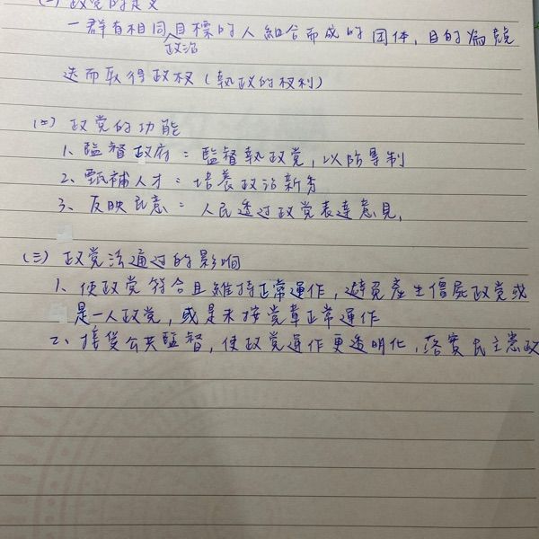 2.政黨政治:透過政黨互相競爭,來實現民主政治中的人民主權、有限政府、分權與制衡等民主原則的政治運作模式。