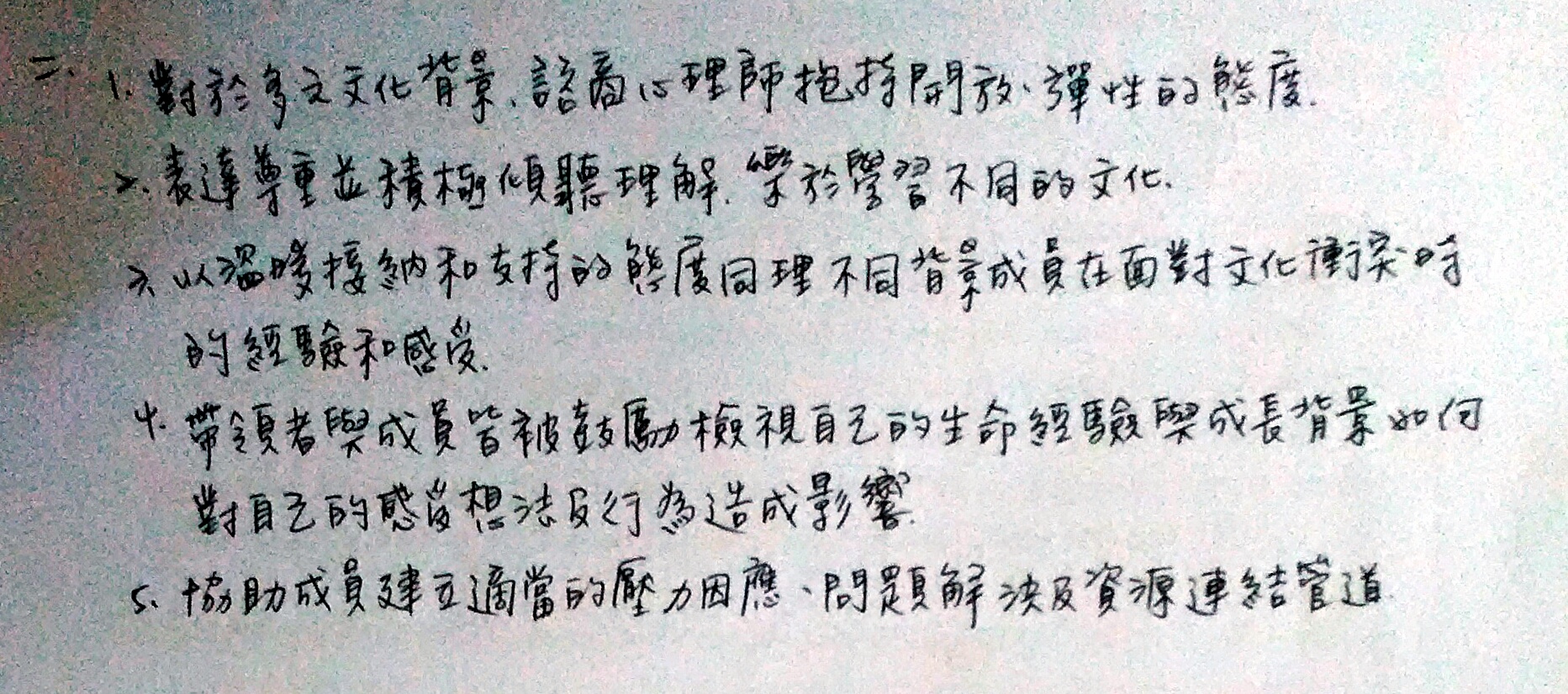 態度:覺察自我價值觀。對於不同文化價值的觀點和態度。自我價值信念對諮商過程的影響。對不同文化價值觀的態度對諮商過程的影響。