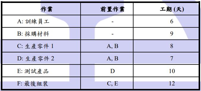 二題 請以箭線圖 (AOA, Activity on arrow) 劃出以下專案的網圖,並標示出要徑。