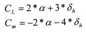 可以下列式子表示,式中之 α 為攻角,δh 為水平尾角度。設定飛機之重量為 24010 lbf,飛行速度為 350 ft/sec,空氣密度 0.00098 slug/ft³,機翼面積為 200 ft²,平均氣動力弦 (mean aerodynamic chord) 為 30 ft,假設攻角很小,即 L ≈ N (L 為升力而 N 為 normal force),數學式中的角度單位為度 (deg)。試算出飛機達水平配平穩定飛行 (trim flight) 時的攻角及水平尾角度為何?水平尾往上或往下?