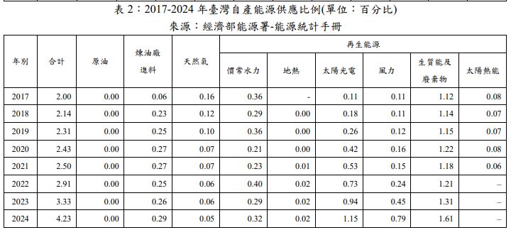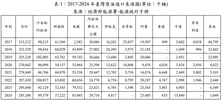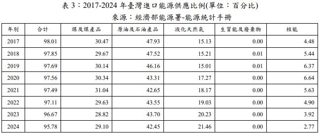 六、2025 年臺灣進口能源依存度 94.69%,其中進口石油依存度為 99.02%,若供應國發生戰爭或內亂,油價水漲船高,連帶影響臺灣的經濟。表 1 為臺灣近年來原油進口來源國,表 2、表 3 為臺灣自產及進口能源供應比例表。
