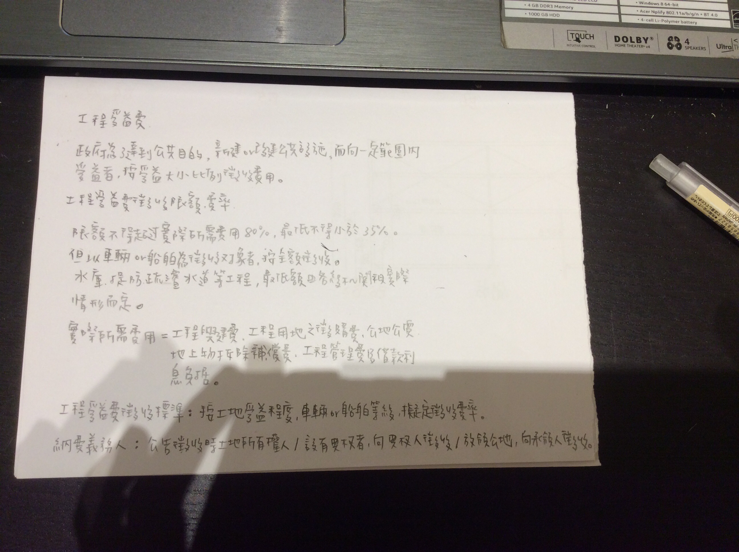 1.工程收益費徵收原因:各級政府在該管轄區域推動都市建設提高土地利用交通便利或防止災害所建築橋樑港口碼頭水庫堤防疏通水道及其他各項工程就直接受益之私有土地及改良物徵收工程收益費 2.工程收益費有下列幾種 1.工程興建費 2.工程用地徵收費及公地地價 3.地上拆遷補償費 4.工程管理費 5.借款之利息 3.納稅義務人: 1.工程受益費徵收:就其車輛船舶徵收者得計次徵收 2.土地所有權人徵收 3.典權人徵收 4.土地所有權人及典權人未自用則向承租人徵收 5.土地所有權及土地改良物所有權不同人時:則由兩者共同分攤比率徵收,其比率由各級政府訂之
