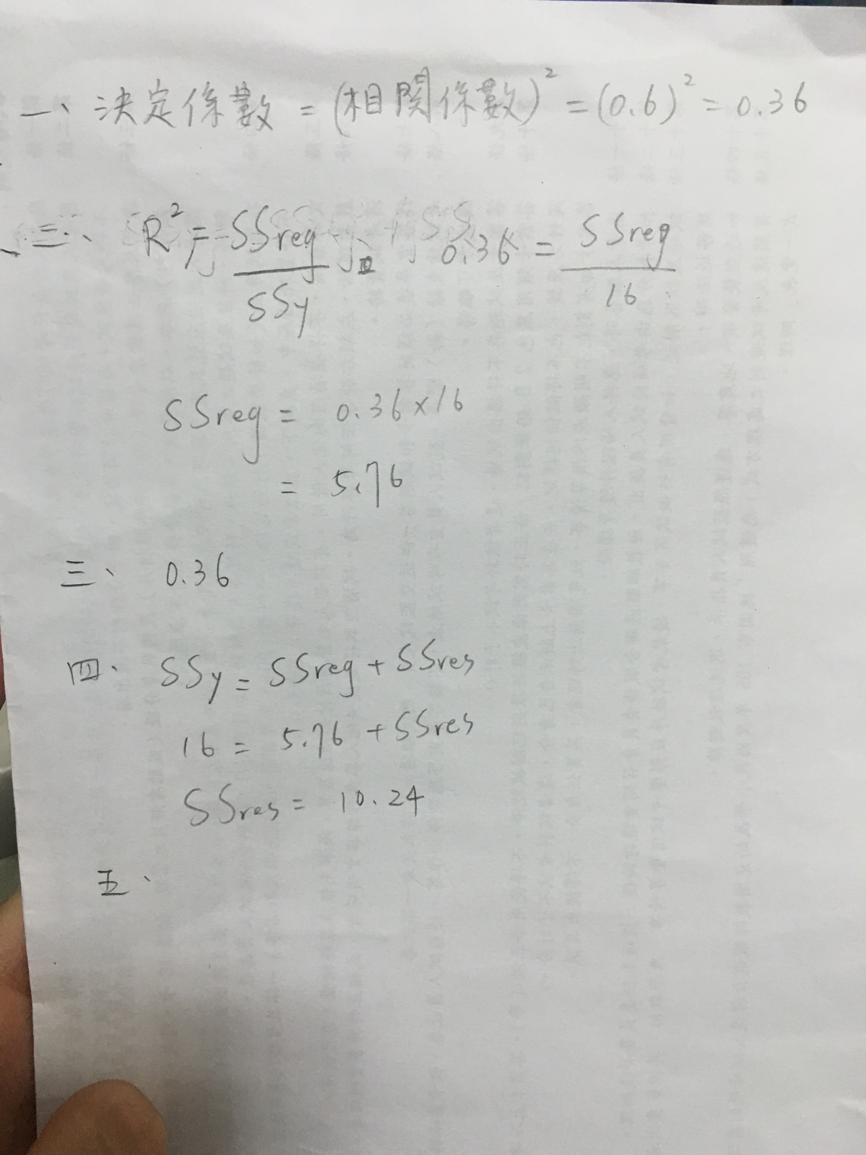 四、由樣本 37 人的在學成績(X)預測大學學測成績(Y),求得積差相關係數 r=.6。 Y 的離均差平方和(SSy)為 16,試問:(每小題 5 分,共 30 分) ㈠決定係數 ㈡回歸離均差平方和(SSreg) ㈢SSreg 占 SSy 的百分比 ㈣殘差平方和(SSres) ㈤Y 之標準差 ㈥估計標準誤