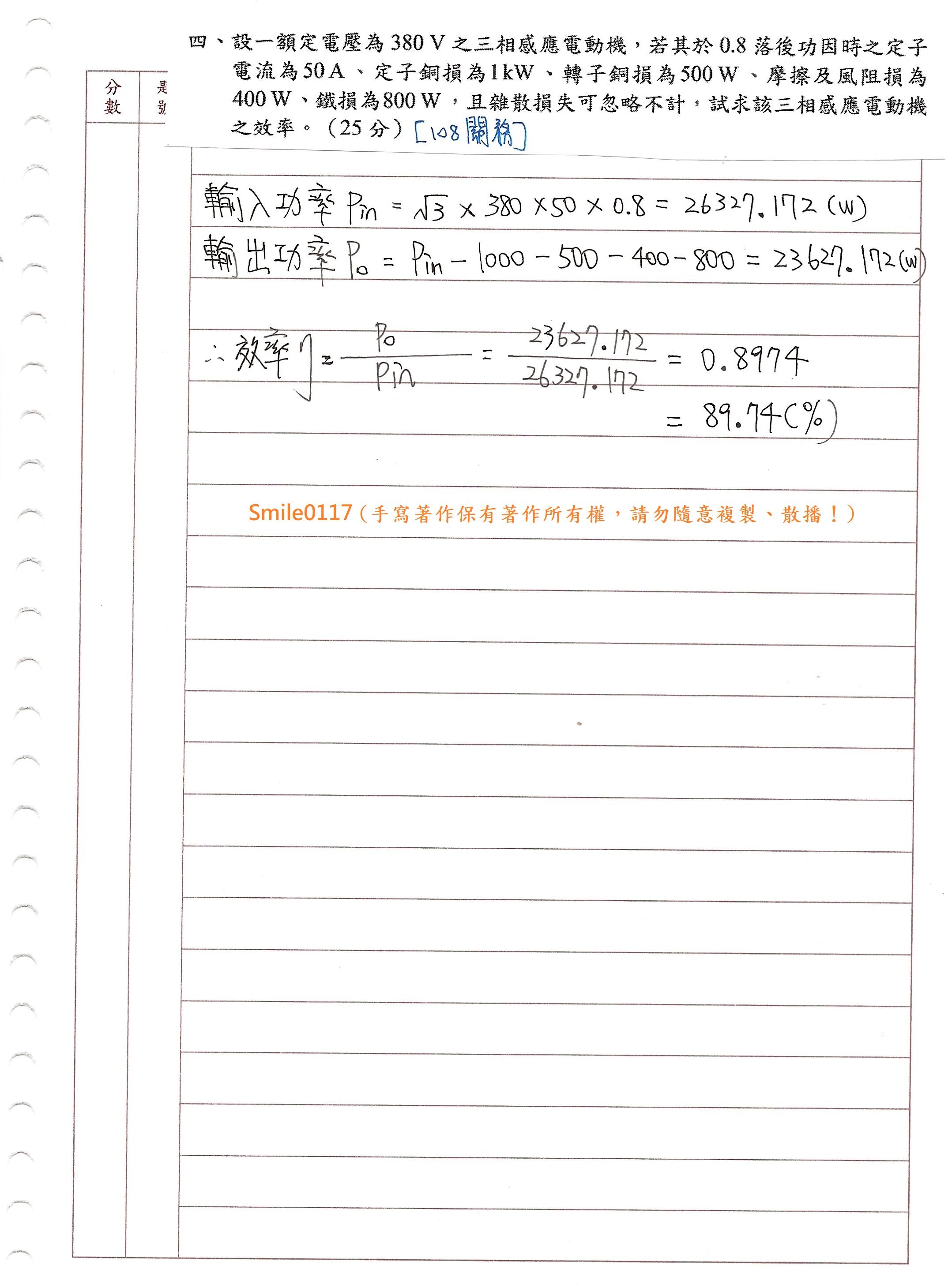 四、設一額定電壓為 380 V 之三相感應電動機,若其於 0.8 落後功因時之定子 電流為 50 A 、定子銅損為 1 kW 、轉子銅損為 500 W 、摩擦及風阻損為 400 W 、鐵損為 800 W ,且雜散損失可忽略不計,試求該三相感應電動機 之效率。(25 分)