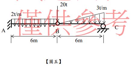 四、試繪製【圖五】所示梁之剪力圖與彎矩圖,B點為鉸接。