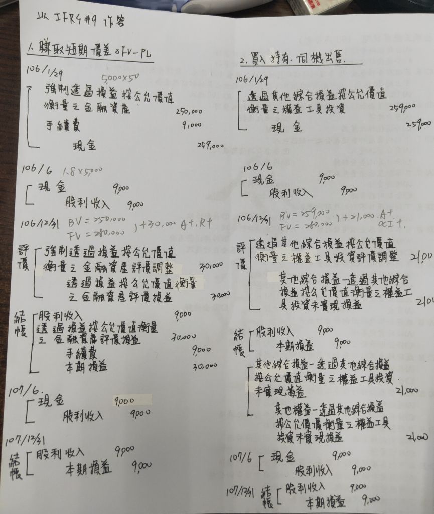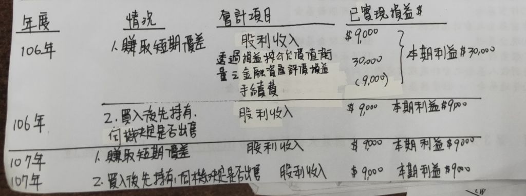 四、金元公司於民國 106 年 1 月 29 日買入參平公司股票 5,000 股,價格為每股 $50,另支付交易成本$9,000。同年及次年 6 月參平公司都發放現金股利, 每股都$1.8,同年底及民國 107 年底參平公司股票之公允價值均為 $280,000。金元公司購入參平公司股票之目的,得為賺取短期價差, 或買入後先持有,伺機決定是否出售。 請為金元公司在上述二個目的下,分別計算民國 106 及 107 二個年度已 實現損益的金額,以及說明這二個年度使用之會計項目,並依下列格式 作答於試卷上。(20 分)