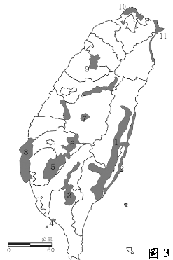 ◎我國目前有13處國家風景區,這些國家風景區的景緻各有特色,往往吸引國內外眾多遊客。右上圖3為臺灣本島之「國家風景區」分布圖。請問: