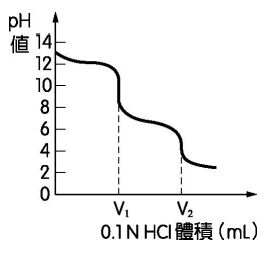 12. 附圖為 Na2CO3 與 NaOH 之混合溶液 20 mL,被 0.1 N HCl 滴定的曲線。V1=14mL、V2=22 mL,則
