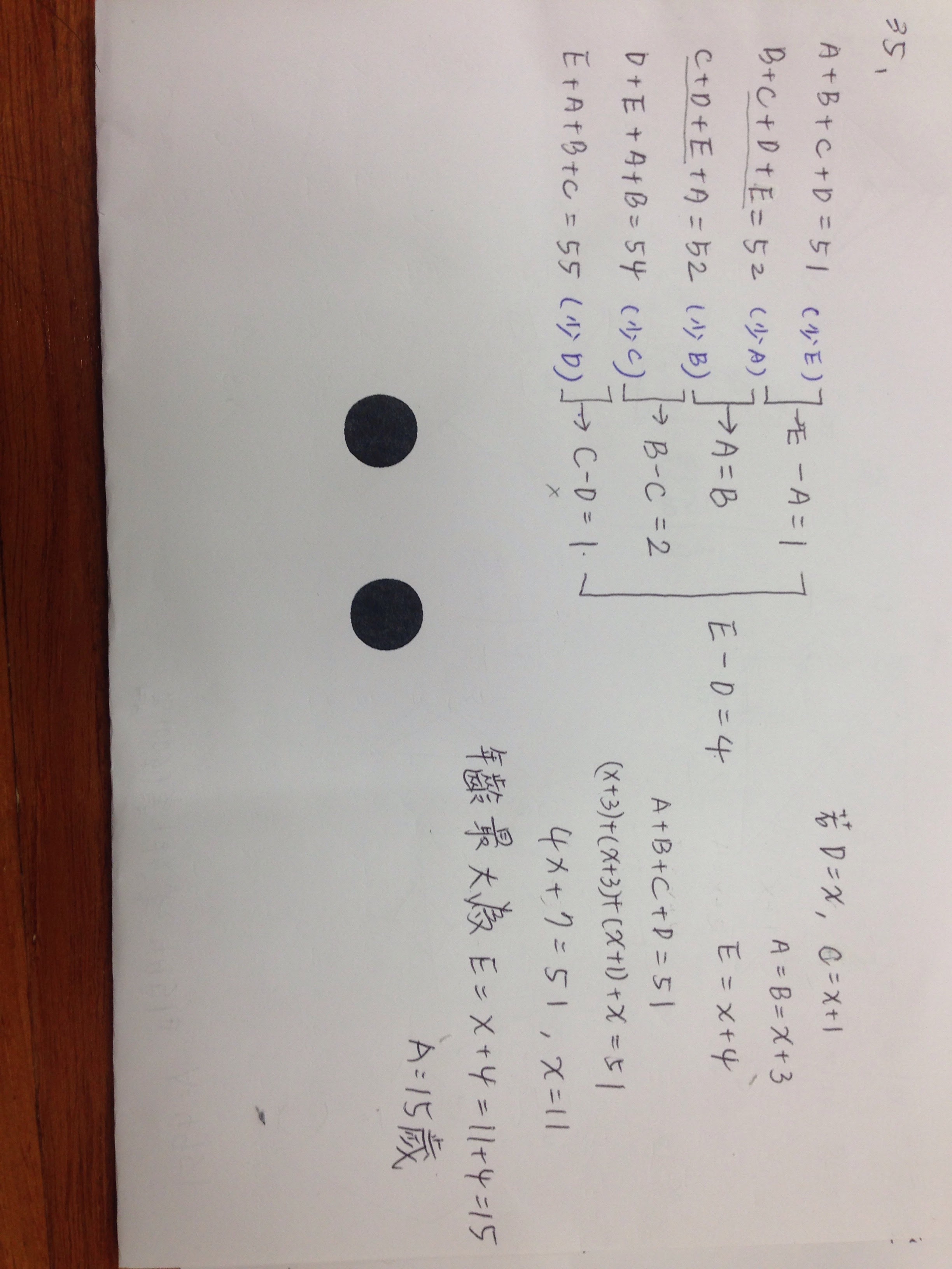 設五個人的年齡由大到小排列各為a,b,c,d,e歲 a+b+c+d =51 b+c+d+e=52 a+ +c+d+e=52 a+b +d+e=54 a+b+c +e=55 以上五個式子相加會等於 4a+4b+4c+4d+4e=264 4(a+b+c+d+e)=264 a+b+c+d+e=264/4 a+b+c+d+e=66 前四個較小的年齡加總為a+b+c+d=51 所以66-51=15 所以年齡最大為15歲