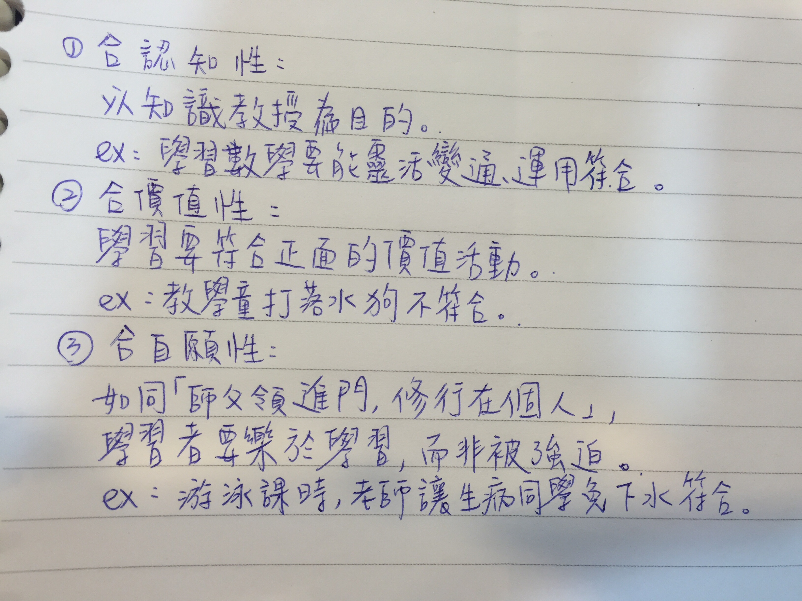 1. 合認知性 屬「真」的規準。需顧及學生的認知發展結構與知識的結構。 ex:直角三角形兩鄰邊平方和等於斜邊平方和。(教育) 2.合價值性 屬「善」的規準。是內在的、非工具性的及普通性的價值。 ex:教導學生「偷竊能夠滿足個人慾望,所以偷竊是必要的行為」(即為反教育,非合價值性。) 3.合自願性 屬「美」的規準。自主學習。 ex:教師在課堂上宣揚自己的宗教,強制要求學生珮合進行相關活動(違反學生的自由意志,非合自願性)