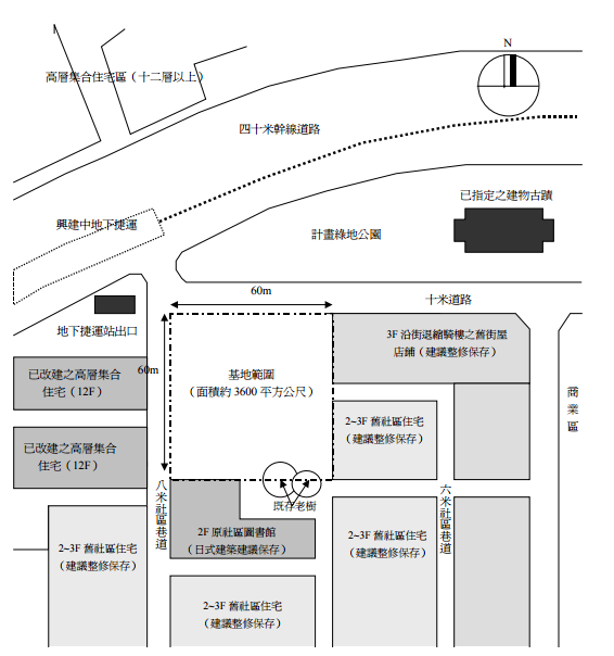 一、題目:社區文史資料館與里民活動中心設計 二、題旨:二十一世紀都市高度發展與擴張的結果,對比出既有都市中老舊社區街道的更新再生與 永續發展之迫切課題。台灣某都市舊城區有一處發展比較緩慢之沒落街區與舊有社區,現況建 物老舊且周邊環境條件不佳,公共建設亟待改善。但是,該社區擁有部分日據時代留下之歷史 建築與部分保存完整之舊街區風貌,雖然並未被指定為必須保存之歷史建物,然而當地居民社 區意識相當強烈,透過活躍的社團組織及文史工作者多年努力,對於當地文史資料保存亦十分 完整。最近社區北面帶狀綠地公園預定地上,有一棟紀念性歷史建築被指定為古蹟保護,被視 為重要之觀光資源,同時隨著都市的發展,社區北面臨三十米交通幹道下方因地下捷運系統通 過,未來將建設捷運地下車站出口在社區西北向路口。地方政府與當地居民都非常希望藉此契 機,在兼顧活化社區發展與歷史風貌保存的前提下,特別提供社區範圍內一部分可供建築之公 有土地,並獲得某民間團體之捐助,擬以創造永續環境與活化社區為目標,徵求社區文史資料 館與里民活動中心之綜合規劃設計提案。 三、空間與機能基本需求:根據規劃構想,建築總樓地板面積以不超過 2000 平方公尺為原則,空間 需求項目必須大致符合,空間量體分配及面積比例則可自行斟酌規劃,設計者必須約略估算並 標示設計提案之大約總樓地板面積,空間量之合理性將納入評量。 ⑴展示空間(約 300 平方公尺):以當地文化歷史資料及環境變遷資訊展示為主,需考慮合理 之動線安排及適切之展示空間機能。 ⑵簡報室或居民學習教室 2 間:可容納 40~60 人之學習活動空間。 ⑶小型會議室 2 間:可容納 20~30 人之工作會議或小型研討活動之使用。 ⑷研討室或工作室 5~8 間:可提供 5~20 人不等之小型研討活動或個人技藝工作室之使用。 ⑸遊客居民休憩或自由交流空間:可規劃輕食區、兒童遊戲場或咖啡座,提供當地居民及外來 遊客參觀後休憩或自由交流之場所。 ⑹辦公行政管理空間:行政管理人員約 6 人,部分活動將來會徵求居民義工之協助。 ⑺公共廁所:依實際需求及法規規定規劃適宜之廁所空間,並考慮人性化通用廁所之設計。 其他創意空間:依規劃構想與題旨要求有關之空間,只要有助於社區活化與再生永續發展, 具明確有說服力之構想,均可自行斟酌納入規劃。 步道、樓梯、坡道、電梯等動線設施需符合無障礙環境需求。 基地範圍約 60 公尺×60 公尺,周遭環境情況大致如圖所示,社區住宅大多為日據時代到台灣 光復初期建造之二、三層連棟斜屋頂公寓,沿街之街屋也大約為同時期之建築形式,頗具特 色,社區居民也多數同意保存修建之整體規劃原則。 四、「建築計畫與建築設計」注意事項: ⑴建築計畫部分應依題旨,透過建築專業的整體計畫構想,利用目前社區有利之發展機會與原 有之街區風貌特色,提出社區整體環境改善之具體構想提案,兼顧社區居民必要完整之生活 需求,研提建築規劃設計準則及設計構想策略,並具體說明與評估規劃設計方案達成之目標 與解決之問題。建築計畫內容必須包括整體環境構想、內外空間計畫與動線組織、基地環境 ⑵建築設計部分必須完整規劃設計社區文史資料展示與里民活動需求之建築,功能除了提供外 來遊客或訪客瞭解該社區特色與重要文史資料外,也要提供當地居民一個活動聚會、休閒教 育之去處。同時也希望建築設計能落實永續綠建築之理念,盡量規劃自然通風、自然採光設 計手法與節水省電構想,以減少日後建築營運維護之能源、資源費用,並作為重要之示範綠 建築案例。 ⑶建築設計內容須包括汽機車停車場規劃,依法規定總樓地板面積超過 300 平方公尺部分,至 少每 150 平方公尺設置一輛。 ⑷基地為假想之台灣某都市環境,年平均氣溫約 24℃上下,年降雨量豐沛約 2000mm 以上,年 降雨天數也大多超過 80 天,日照條件亦佳,年平均日照率 50%以上,相對濕度偏高。夏季以 吹東南及西南季風為主偏高溫濕熱,冬季東北季風強烈且寒冷多雨,建物開口宜小心規劃。 五、建築設計方案圖說要求