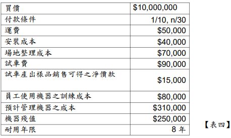 乙公司於 X0 年 4 月 1 日購入某機器設備,該公司於 X0 年 4 月 10 日完成付款。該機器的資訊如【表四】所示,請回答下列問題:(未列出計算過程者不予計分)