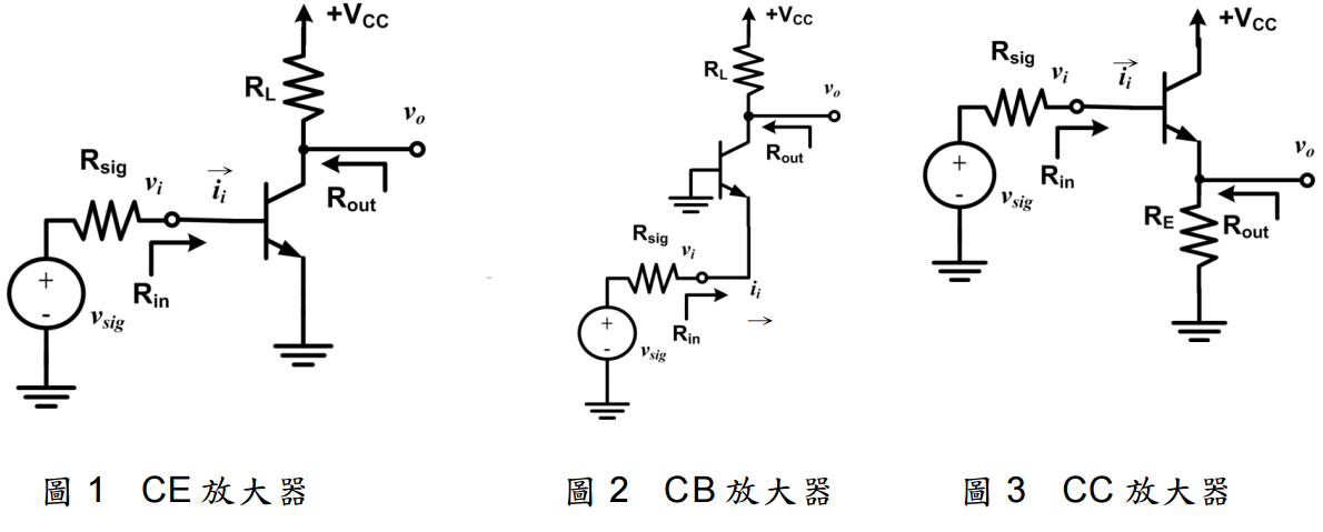 四: 下列各圖為由 BJT 所構成的共射(CE)、共基(CB)及共集(CC)放大器的簡圖(偏壓電路 略去未顯示),該電晶體的β=100,不計爾利效應(Early Effect)。各 R