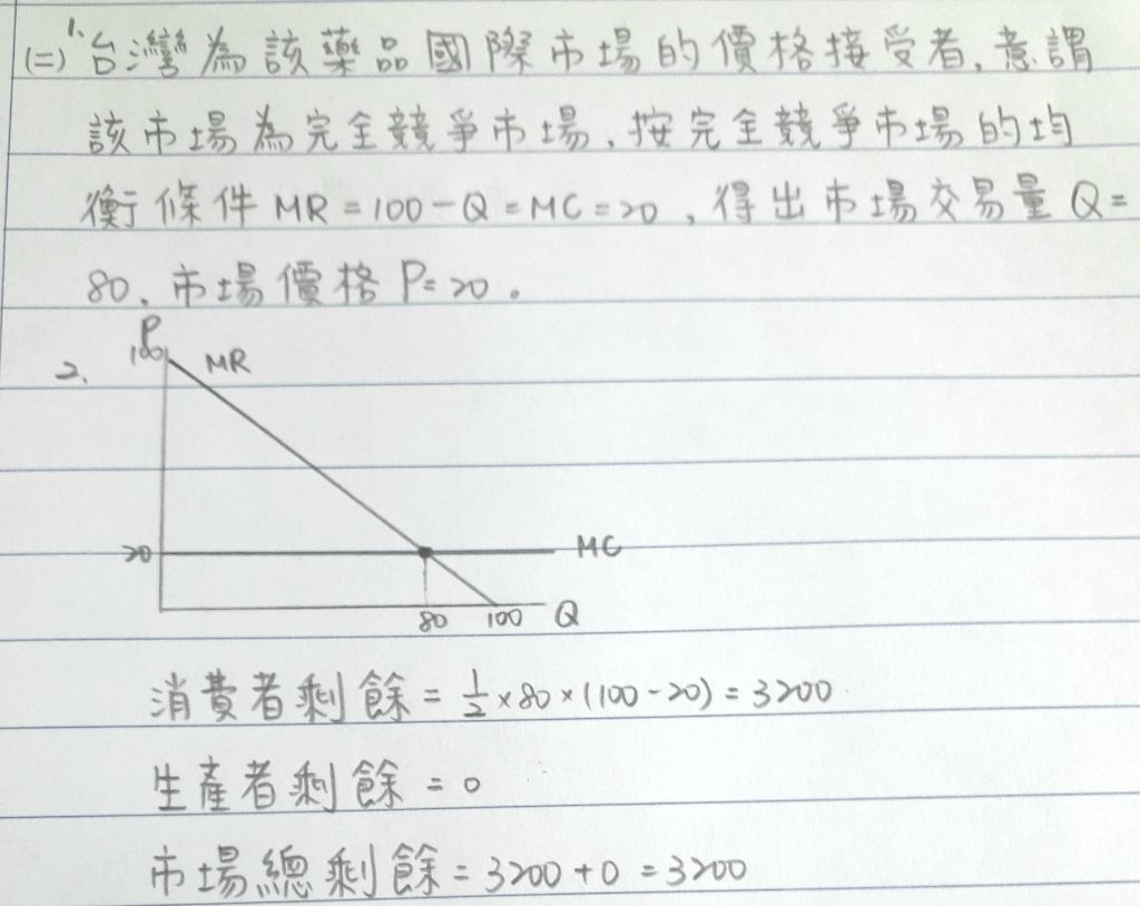 第三題: 假設 F 製藥公司是台灣製造治療新型流行感冒藥品(藥品名稱:免流感)的唯一藥廠, 該藥品在國際市場上有眾多生產者(國際市場為完全競爭)。台灣對該藥品的市場需求函數 為 P = 100 - Q,其中,P 是價格、Q 是需求量;F 製藥公司與國際上所有生產者的技術相同, 生產成本函數都是 TC = 20Q。請依此回答下列問題: