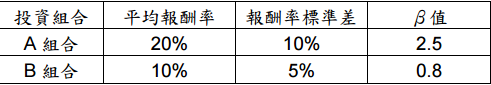 都教授希望將他的退休金投資在A 組合或B 組合中,請就下列資訊回答相關問題:(已知無風險報酬率為5%)。
