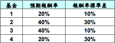 金融市場中有四檔基金可供選擇,其各自的預期報酬率及報酬率標準差分別列於下表: