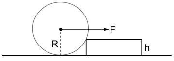 2. 如下圖所示,有一半徑為 R、重為 W、材質均勻的光滑輪子,與高 h 的階梯接觸,靜置於水平地面上。今在輪子中心 處施一水平力 F,使其爬上階梯,若輪子不變形,回答下列問題。