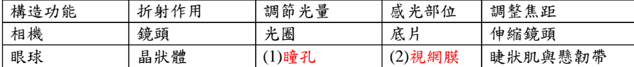 2.眼球內的構造與照相機內部構造的比對,請填入正確的答案。(每格 1 分,共 2 分)
