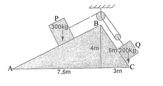 二、如圖所示,P、Q 兩質量塊由繩索通過一滑輪系統,P 質量塊重 300 kg 且與 AB 面 間之摩擦係數為 0.2;Q 質量塊重 200 kg 且與 BC 面間之摩擦係數為 0.25,試求: