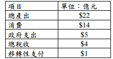 三、考慮某經濟內只有家計、廠商及政府等三部門,此經濟體之總體數據資料如下:
