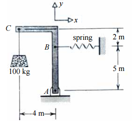 一、如下圖,一配有質量為 M=100 kg 重物之支架,受一彈簧牽制於 B 點,保持如圖所示 之垂直平衡狀態。試問此支架在承受混合靜力負載下:(每小題 10 分,共 20 分)