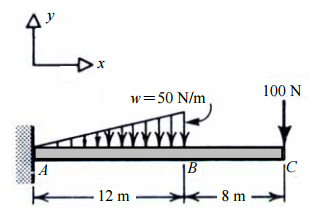 ⑵在橫樑根部(A點位置)的反作用彎矩(bending moment)MA為若干? y x w=50 N/m 100 N A B C 12 m 8m