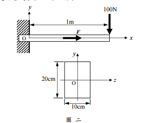 二、一垂直力 100 N 及一水平力 F 施加於一等截面之懸臂梁如圖二,圖二同時顯示梁在 O 點的截面。