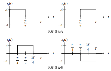 四、考慮圖二所示兩個訊號集合 A 及 B。每個集合都可用於等機率二元傳輸(binary transmission)之基頻訊號。其中 T 代表一個傳送符元區間(symbol interval) 為 ,A 振幅大小。假設該訊號經過可加白色高斯(AWGN)通道,功率頻譜密度為 N