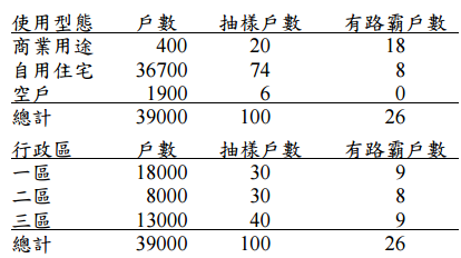 四、某市政府欲了解市民在自家門口設置路霸的情形,先行以使用型態(商業用途、自 用住宅、空戶)及行政劃分(一區、二區、三區)作為層別,分別調查門口設置路 霸的戶數,訊息如下: