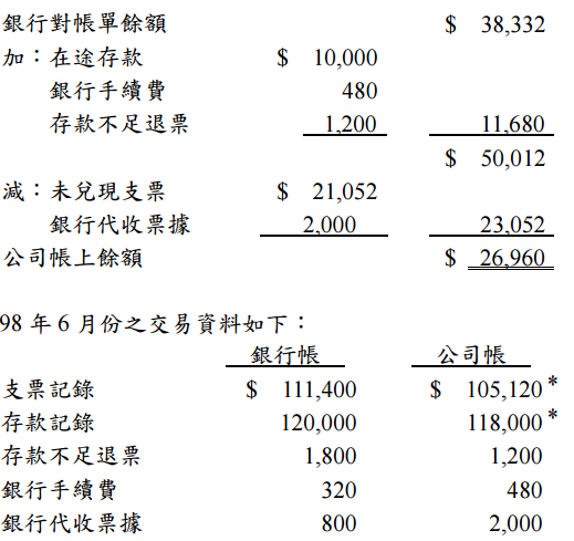 一、甲公司所有收支均透過銀行支票帳戶,其 98 年 5 月 31 日之銀行調節表如下: