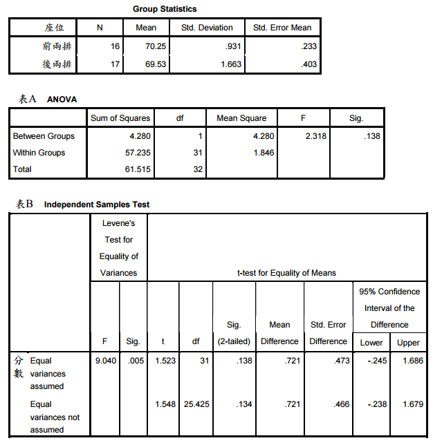 四、有一企業請專家為其員工講授兩天 16 小時的「資訊安全」課程,且規定要課後評 量,評量成績將做為年度考績的參考。業主主觀上認為上課坐前排者較認真,成績 應比較好;坐後排者則反之。課後評量後,業主刻意把前兩排及後兩排的成績分開 處理,然後請其助理群比較前、後排的得分是否有顯著差異。但其助理群對統計分 析的方法有不同的看法。A 助理認為以單因子變異數分析處理會較有深度,而 B 助 理則認為用 t 檢定比較簡單,也能達到分析的效果。兩人根據同樣的資料運用電腦 軟體分析出來的結果如表 A 及表 B。 試根據前述及表 A、表 B 回答下列問題: