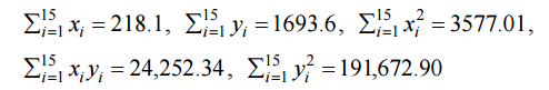 六、黏土磚塊重量的變異對建築物的結構、通風、隔音、隔熱等之設計非常重要。以下 為在一實驗中,由一組黏土磚塊之灰泥隨機樣本所得到,有關灰泥乾燥密度(y)與灰 泥空氣含量(x)之 15 筆相關數據(x