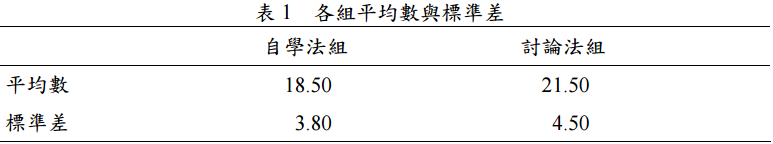 二、某校想探討自學法和討論法對於學生數學科的學習是否有顯著差異。經過隨機抽樣, 共取得 24 位學生,並隨機分派到自學法組和討論法組進行實驗(每組 12 位),經 過一段時間實驗,其測驗結果如表 1,請根據資料回答下列問題:(α = .05 )