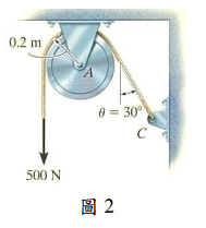 二、如圖 2 所示,繞於無摩擦力滑輪上之繩索支撐一 500 N(牛頓)的向下拉力。