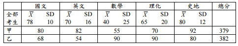 二、甲、乙兩人在各科成績如下表所示,依據全部考生在各科的平均數( X )與標準 差(SD):