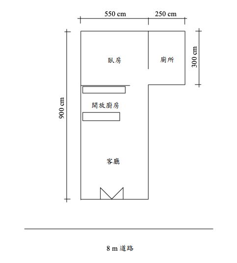 三、一位業主隨手畫了一張草圖(如下圖) ,因為預算有限,希望以最經濟的方式委託設 計一棟混凝土加磚造(RC 結構+磚牆)的一層樓小住宅,基地南側有 8 m 道路,建 築向北約退縮 1.5 m,圖中已標示出基本尺寸,以及各個功能空間相對的位置,樓高 淨高 2.8 m,採有女兒牆之平屋頂形式,各個房間含廁所至少都有一個對外開窗。請 依此草圖與敘述,繪製此建築之: