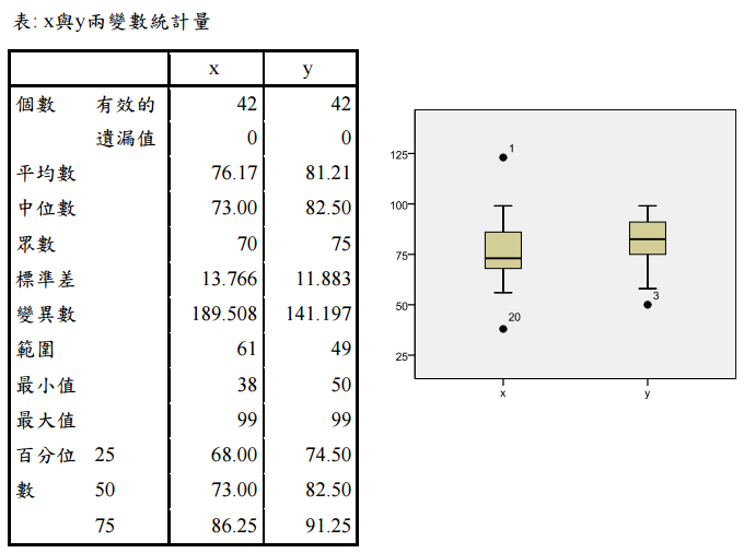 ⑶代表 x 與 y 兩變數 box 中的直線分別是多少?(10 分)