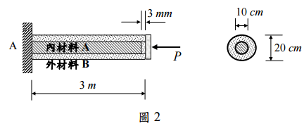 二、如圖 2 所示,一標稱長度為 3m 之圓形斷面均質彈性材料 A,其外層包覆另一均質 彈性材料 B,但二者並未粘接。兩者之斷面直徑分別為 10 cm 及 20 cm,其彈性模 數則分別為 E