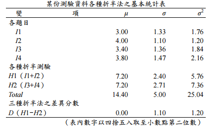 三、假設有一個測驗是由四個題目所組成的,各題的平均數、標準差與變異數,以及折 半之後的各種有關數據分別呈現於下表中,如果 H1 與 H2 之間的相關為.9154。請 根據這些數據來回答下列的問題:(每小題 5 分,共 25 分)