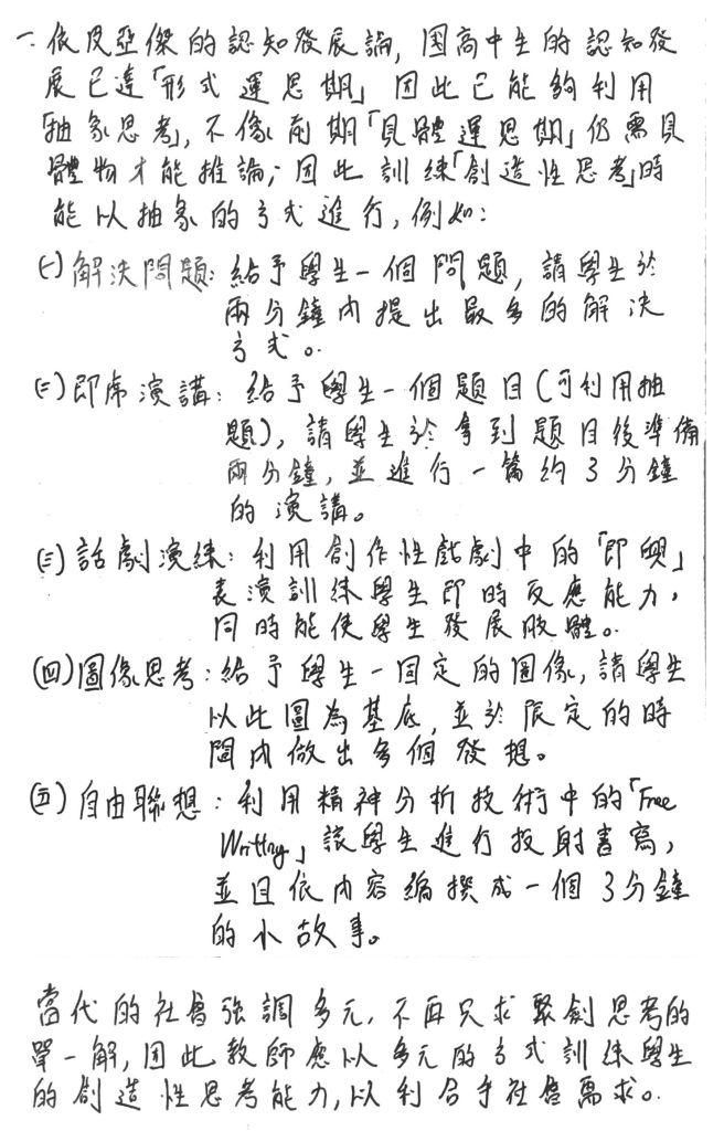 2、楷模學習:平常透過教學給予一些具創造性思考的例子,讓學生學習模仿其思維。