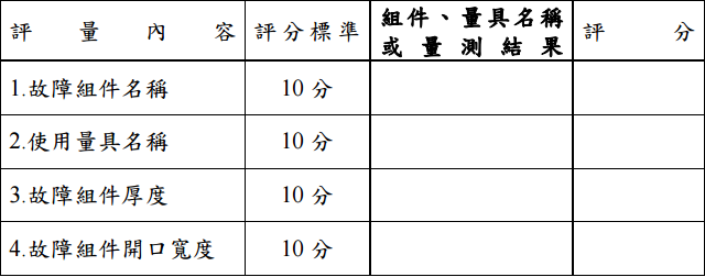 一、裝卸機具組件維修:(40 分) 試題:某台堆高機柴油引擎之故障組件拆卸,請實地量測(單位:mm)並記錄於 下表「組件、量具名稱或量測結果」欄內。