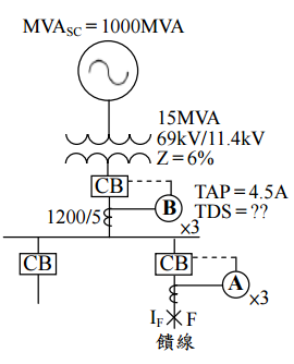 四、某工廠電力系統,其 69kV側之短路容量為 1600MVA,主變壓器容量、變壓比及百分 阻抗值分別為 15MVA、69kV/11.4kV及Z=6%,主變二次側及饋線皆應用CO-9 型過電 流電驛於短路故障之保護,分別為電驛A與電驛B,如圖所示,其保護協調時間間距( CTI)要求至少為 0.3 秒。已知電驛B之過電流始動值(Tap)設定為TAP=4.5A,假設 在饋線(F點)發生三相短路故障時,電驛A之動作時間為 0.28 秒。請應用標么法 ,並採用基準容量(MVAb)及基準電壓(kVb)分別為 15MVA及 11.4kV,試求: