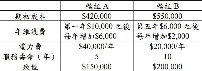 五、某公司正考慮安裝機械模組,下列為兩模組之資料,假設 MARR=10%